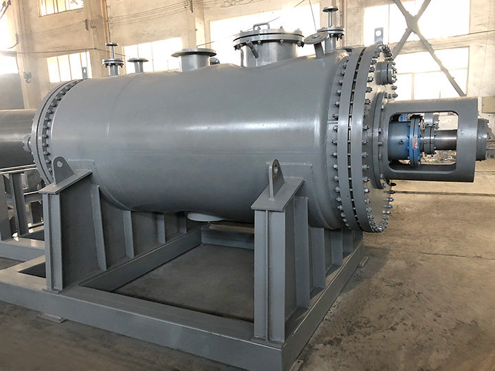 被干燥物料從殼體上方正中間加入,在不斷正反轉(zhuǎn)動(dòng)的耙齒的攪拌下,物料軸向來(lái)回走動(dòng),與殼體內(nèi)壁接觸的表面不斷更新,受到蒸汽的間接加熱,耙齒的均勻攪拌,粉碎棒的粉碎,使物料內(nèi)的水份氣化,在真空系統(tǒng)的作用下,使被干燥物料內(nèi)部水份和表面水份有利的排出,氣化的水份經(jīng)干式除塵器、濕式除塵器、冷凝器,從真空泵出口處放空。